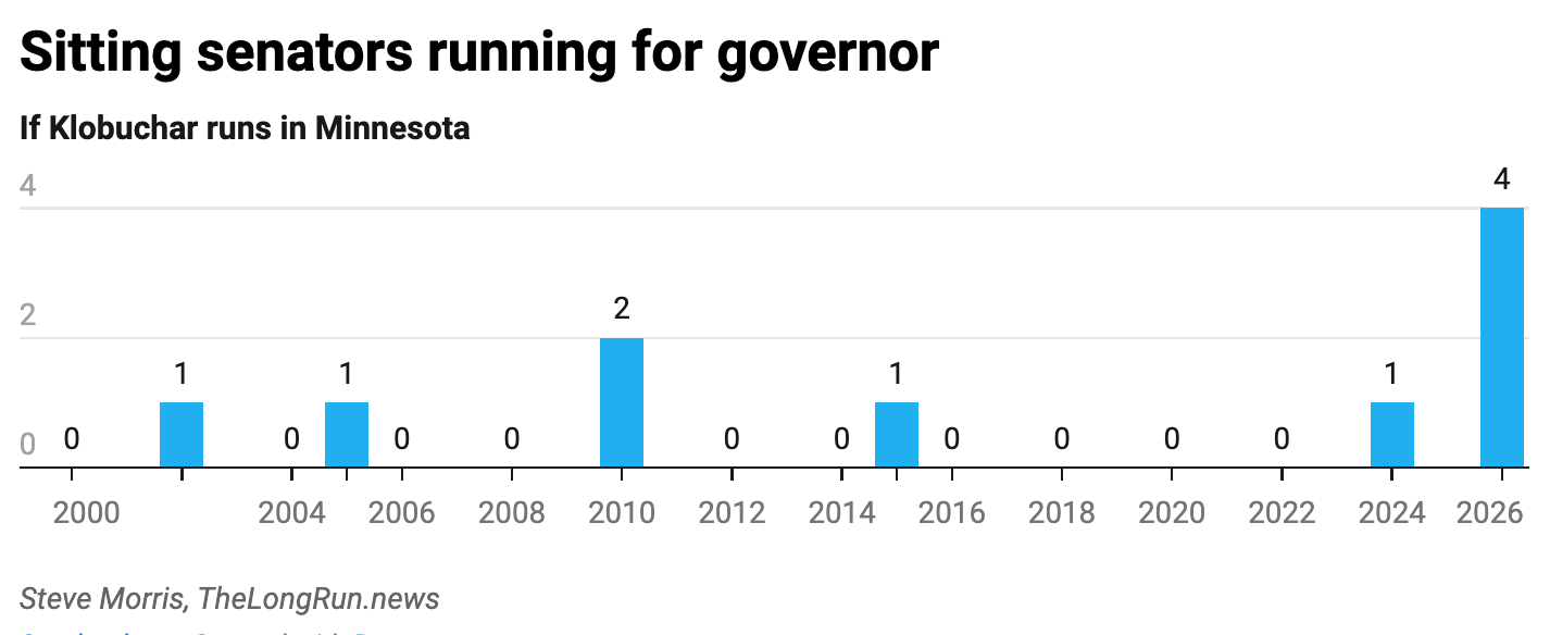 Most interesting of all, however, is this: a Klobuchar-for-governor campaign would cap a notable trend this year. For years, it was far more likely that a governor would seek to join the U.S. Senate than that a senator would try to become a governor. In the 21st century, 10 sitting governors have run for Senate, while only six sitting senators have run for governor. This year, that has changed.