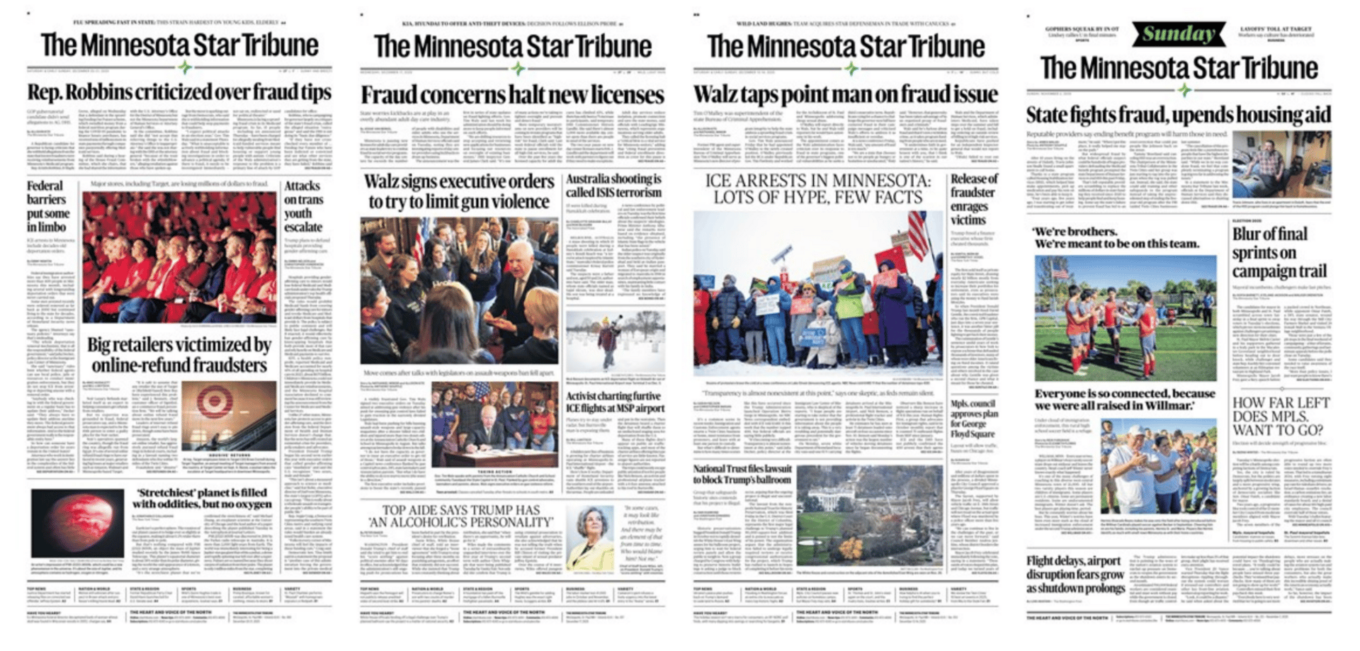 Contrary to many claims on the right (and some wishful thinking on the left), coverage of the scandal originated not from the conservative press but from mainstream media. Local news outlets have been all over welfare fraud in the state as far back as 2013, and they’ve been on this particular story for years now. In fact, this has been a key problem for Walz. I looked into it and, over the past month, a majority of the front pages of the Minnesota Star Tribune — the largest paper in the state — featured the fraud story.