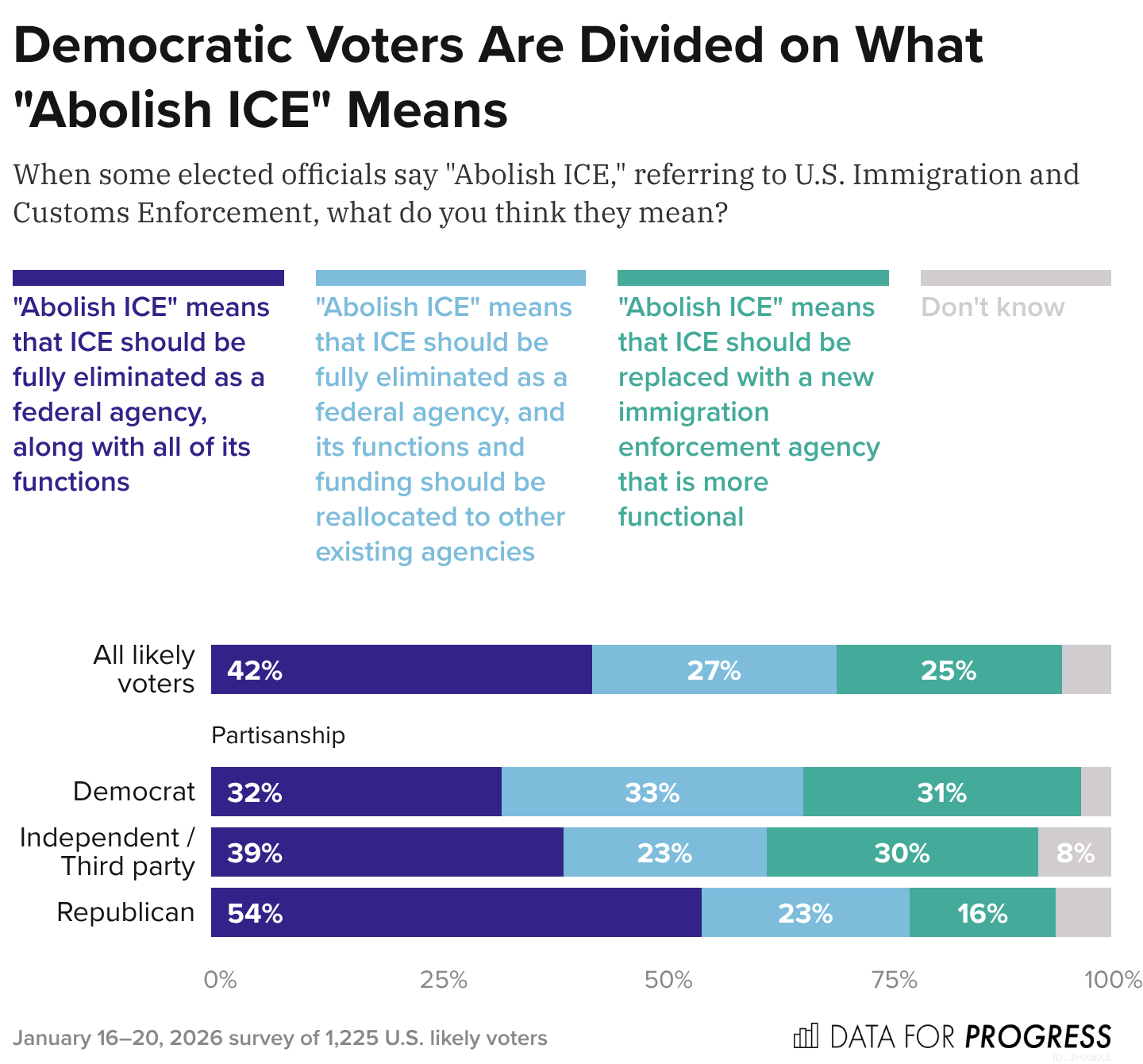 Setting the merits of abolishing the agency aside for a moment, the slogan itself has a number of problems — namely, that Americans don’t agree on what it means. In January, the left-leaning pollster Data for Progress found voters, including the Democrats most supportive of the slogan, split between considering it a call to end federal immigration enforcement or a call to end the current iteration of the agency.