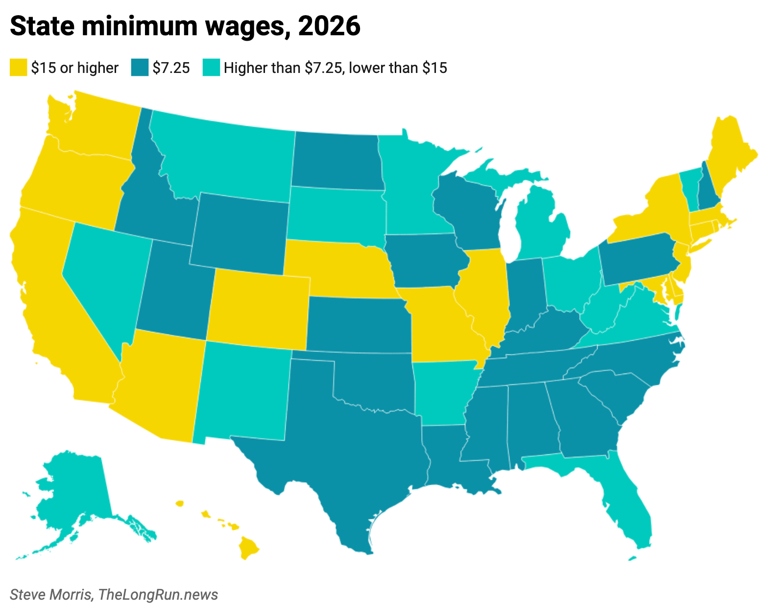 From my research, this appears to be the highest number of states ever to have a minimum wage higher than federal law — a fitting development given we are currently on the longest stretch without a federal minimum wage increase since it was first established in 1938.